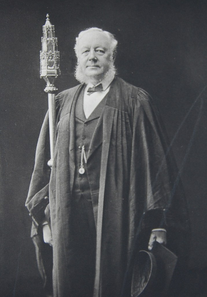 is just under four-foot-long, sterling silver with a gilt cup shaped head, heraldic crown and surmounted by monde and cross. It was crafted in the early 20th Century 1907-1908 by the prominent silver smith Elkington & Co of Birmingham. It was commissioned by Dr Richard Caton on the occasion of his mayoralty. He was Professor of Physiology from 1872 and his work was crucial in discovering the electrical nature of the brain, which laid the groundwork for the discovery of the alpha wave activity in the brain. He became Pro-vice-chancellor of University of Liverpool 1921-4 and was also Lord Mayor of Liverpool (1907–08).