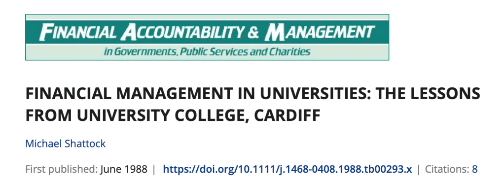Back in 1987, in the period after the government cuts implemented from 1981 onwards, University College Cardiff (UCC) found itself facing insolvency. This necessitated some bold action by the Department for Education and Science (DES) to address the problems which, ultimately, resulted in a successful turnaround for the institution. Full details of the events relating to UCC can be found in this article by Mike Shattock from 1988 entitled Financial Management in Universities: The lessons from university college, Cardiff. I do want to draw out some of the key points from this fascinating piece here.