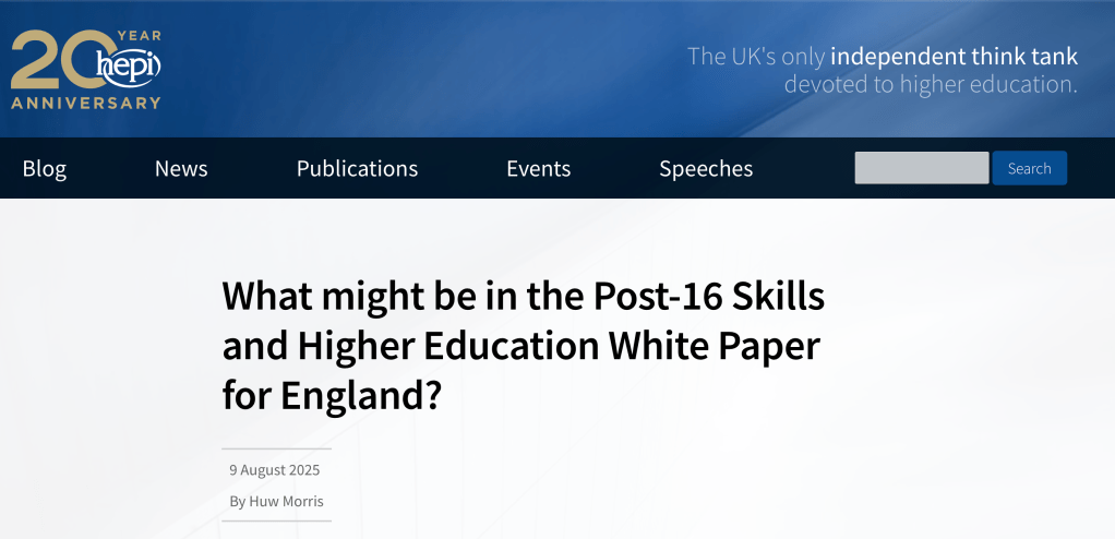 Everyone’s looking forward to the Post-16 Skills White Paper this Autumn. We don’t know what will be in it but there is plenty of informed speculation drawing on no doubt solid inside information. HEPI recently published this comprehensive set of observations and suggestions about what might be in there.