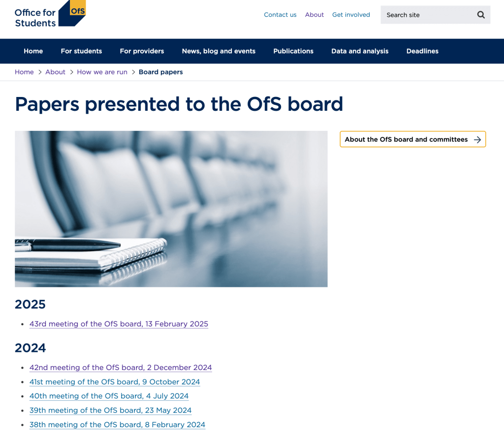 But it does rather look as if the OfS is pretty slow in producing its own board minutes. Indeed, as of today it seems we have not had any Board papers published since the February meeting (there have presumably been at least another two or three since then) and the last board minutes available are from December 2024. If a university governing body was operating to this schedule it would probably come in for more than a little criticism.