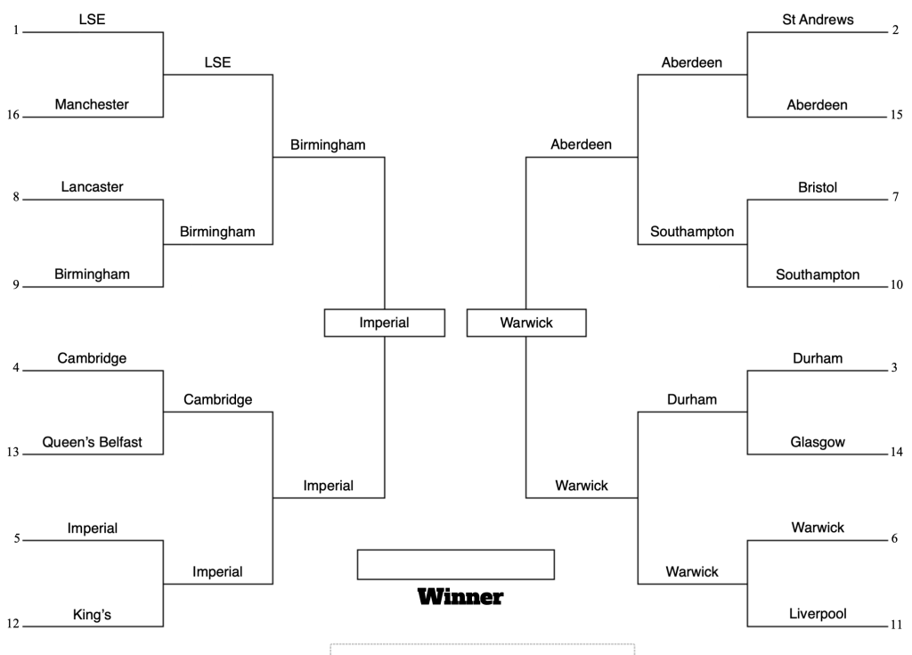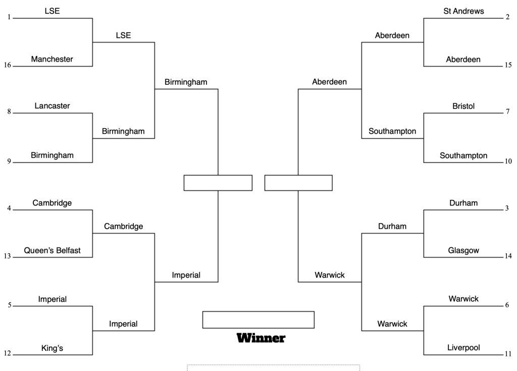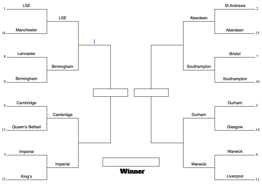First up we have the number one seeds, the LSE, up against the northern powerhouse that is the University of Manchester. The LSE, quite distinctively, has a beaver as its principal shield creature whereas Manchester only has three bees. It really is no contest. Whilst our beaver does not normally welcome a battle with bees, it is going to see them off every time and race through to the quarter finals. Manchester should have stuck with its previous shield, pre-merger, which included a large serpent. It may have stood more of a chance.