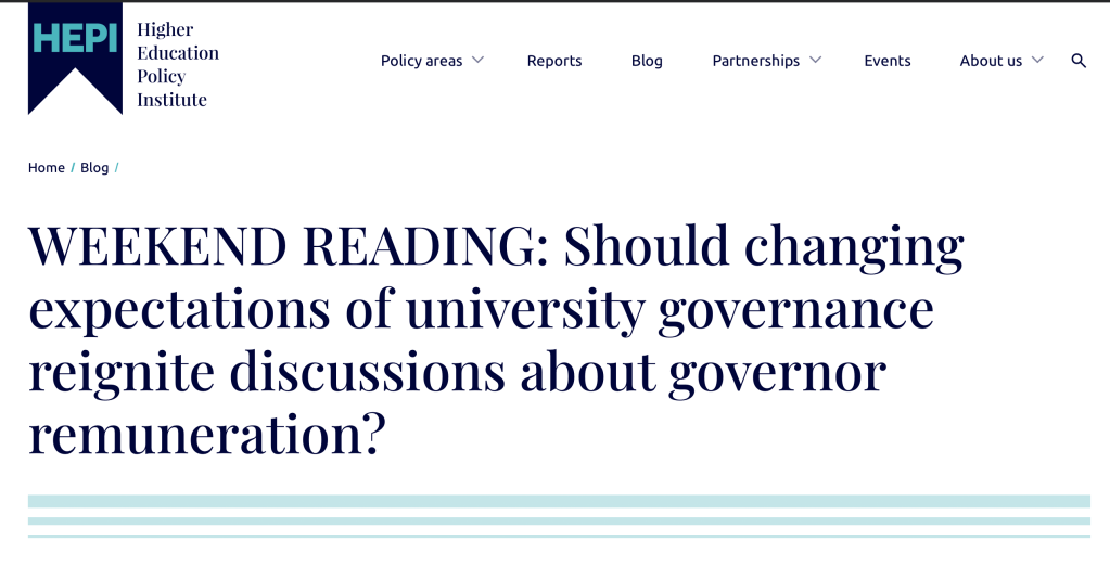 I was pleased to have this piece on a quite specific area of university governance published by HEPI. The article, which I wrote together with Smita Jamdar, Partner and Head of Education at Shakespeare Martineau, covers the thorny issue of governor remuneration.